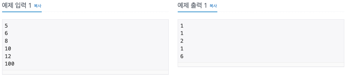 첫째 줄에 테스트 케이스의 개수 T (1 ≤ T ≤ 100)가 주어진다. 각 테스트 케이스는 한 줄로 이루어져 있고, 정수 N은 짝수이고, 2 < N ≤ 1,000,000을 만족한다.