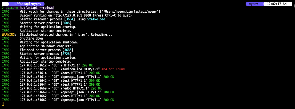 위와 같이 hb.py 파일을 만들고 가상환경에서 uvicorn hb:fastapi --reload 명령어 입력 시 아래와 같이 실행된다.