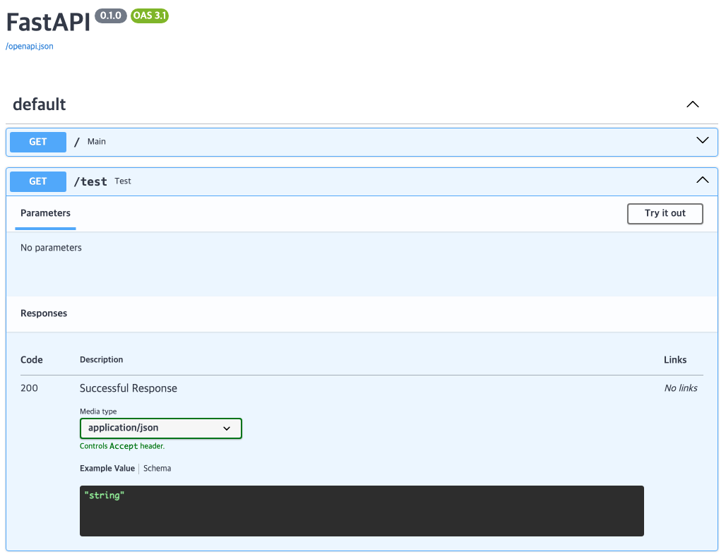 해당 페이지에선 테스트 기능도 제공한다. 함수를 보면 Try it out이 있는데 클릭 후 excute 버튼을 누르면 API를 테스트해볼 수 있다.