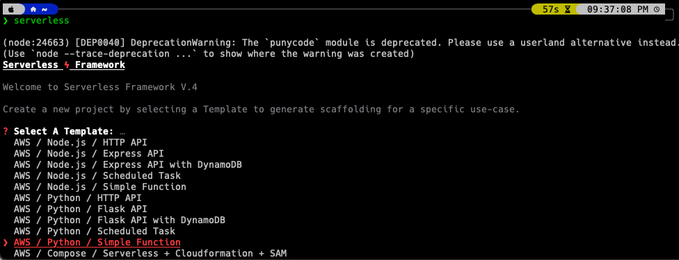 프로젝트 생성 시 여러 템플릿을 지정해서 생성할 수 있다. sls create —template 명령어로 지원되는 템플릿을 확인할 수 있다.